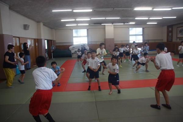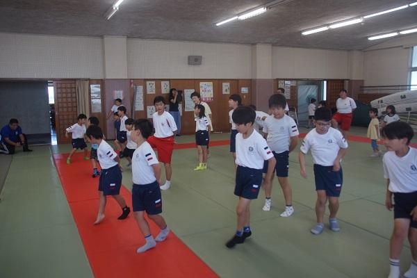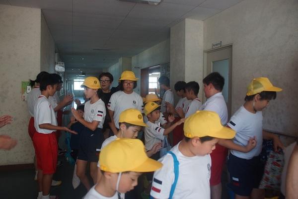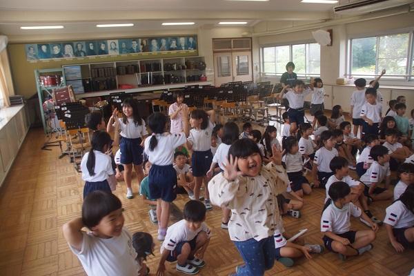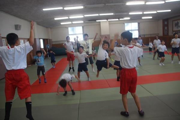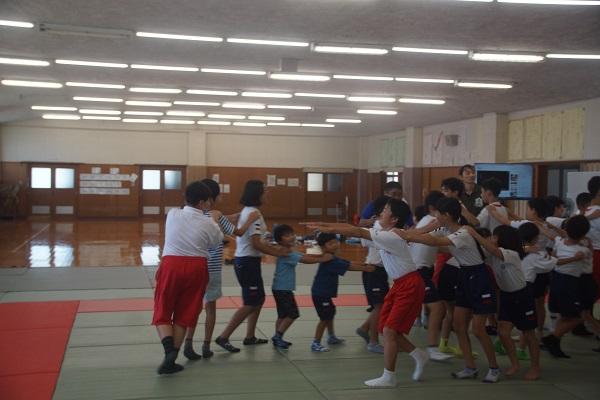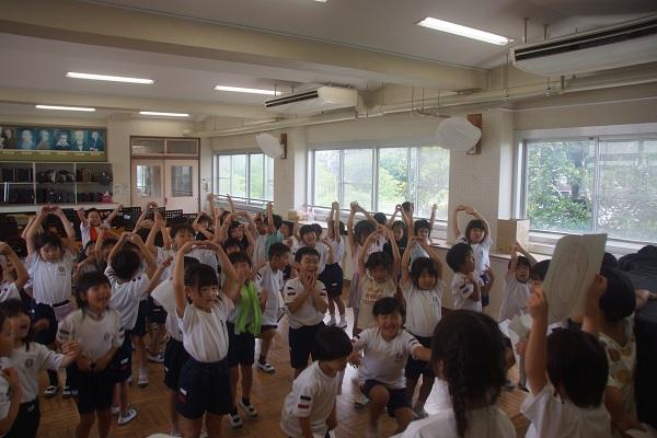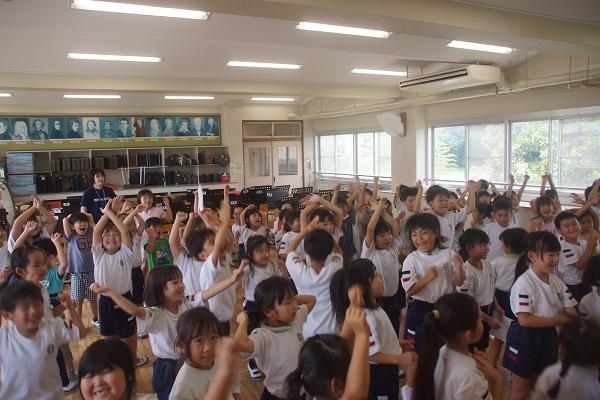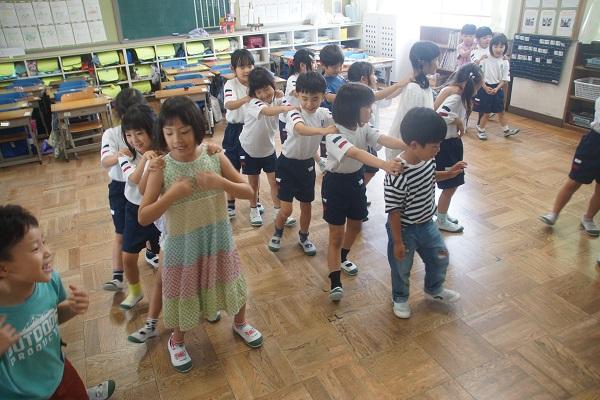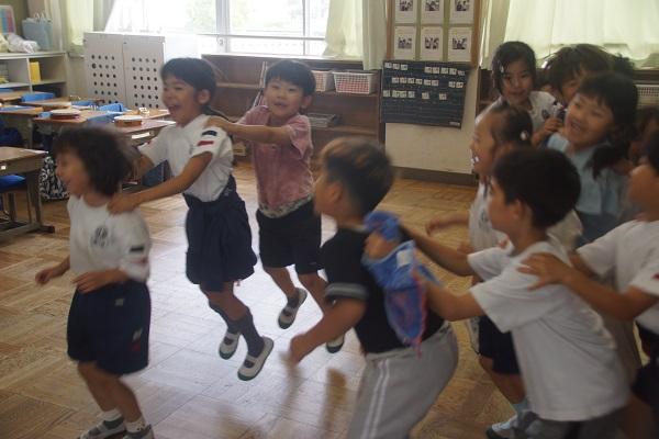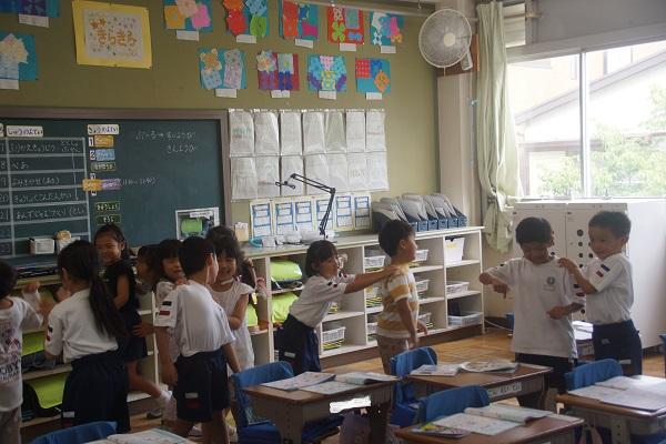 先生の「ゴー・ストレイト」の指示に子どもたちは一斉に前に出ます。本当は足ぶみをすればいいのに、遊んで前進してしまっています。なんだか楽しそうです。何度か「ターン・レフト」「ターン・ライト」を繰り返し、やっと後ろを向いてくれて、先生も藤竜也のようにホッとしたようです。遊んで英語が身につくなんていい時代です。