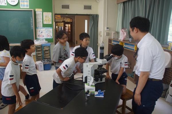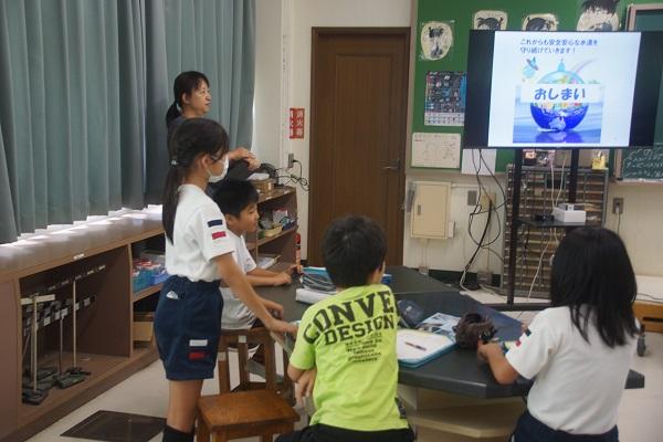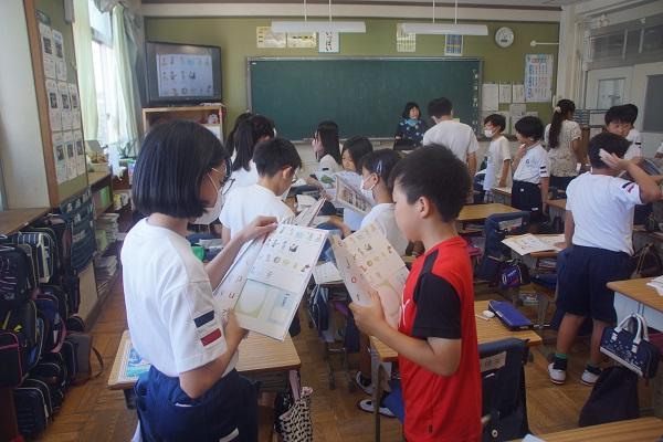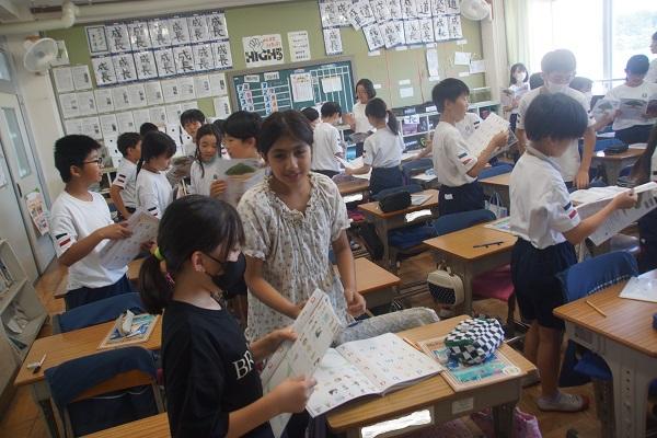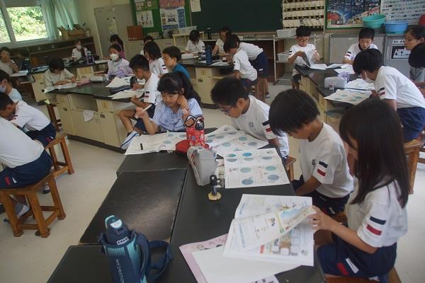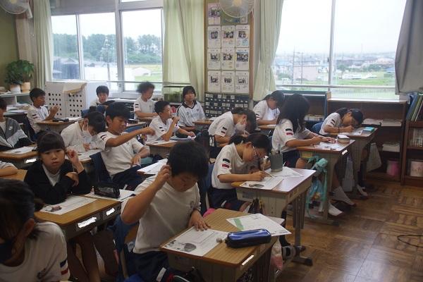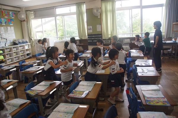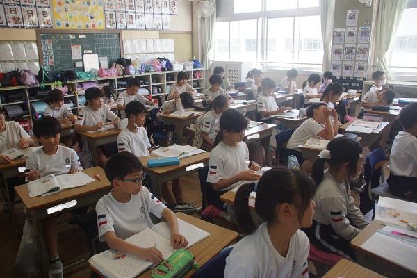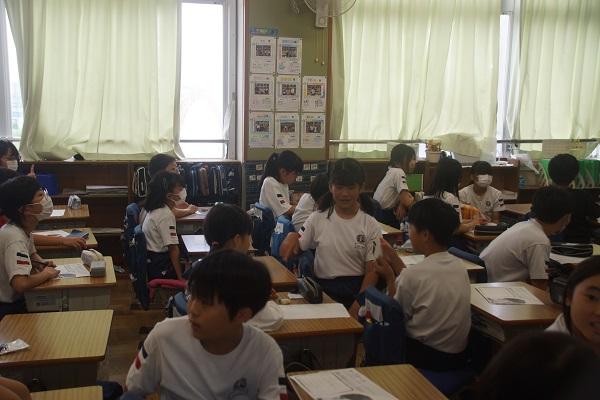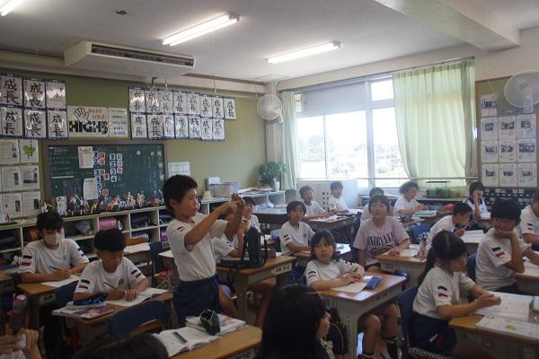5年生が先生方と英会話をしていました。JTEとALTとそれぞれに対して、お客と店員の立場で会話をし、お金を使ってやり取りしています。昨日参観した4年生の外国語活動の授業でも感じたのと同様に、英語の発音がとてもかっこよいです。最近の小学生の傾向でもあるかもしれませんが、私の印象ですが、がんばってくれている成果のため1学期よりもさらに子どもたちが発する英語がかっこよくなっています。私も、かつては英語を教えていたので、とってもうれしく、機会あるときには「磯辺小の子どもたち英語うまいよ!」と自信持って言えるので、このことについても心強く、とても感謝しています。
