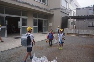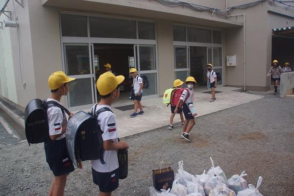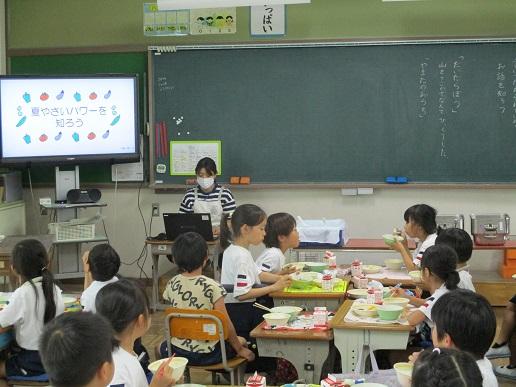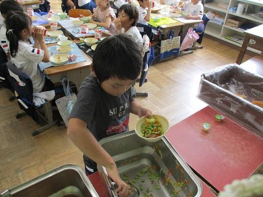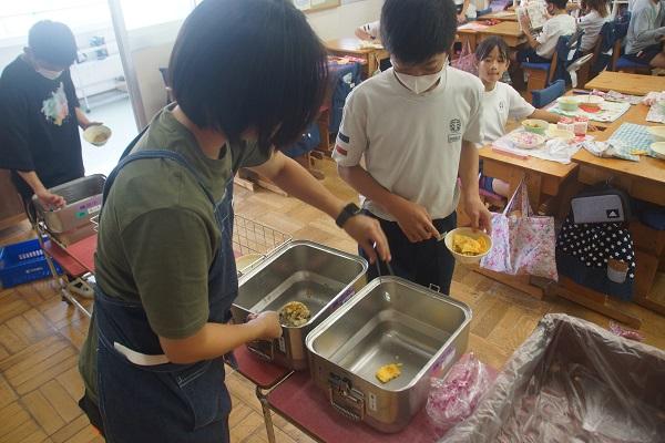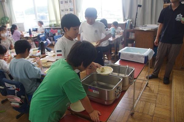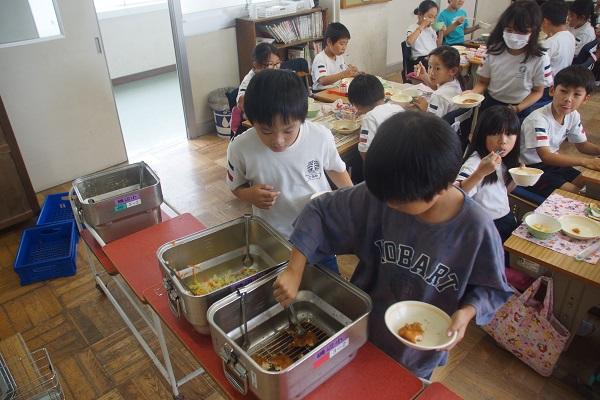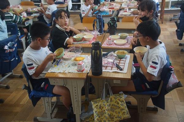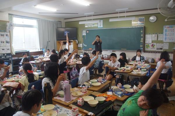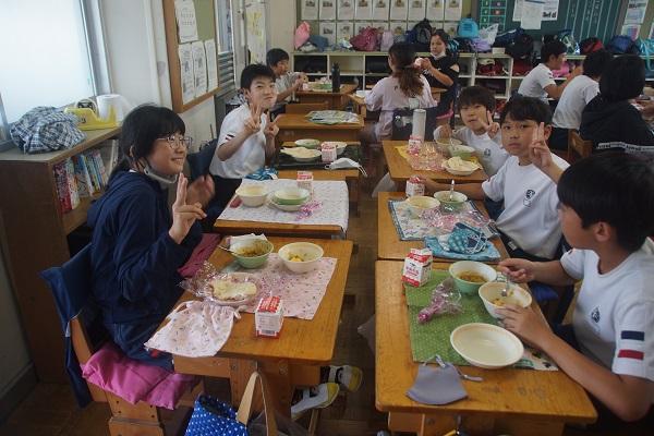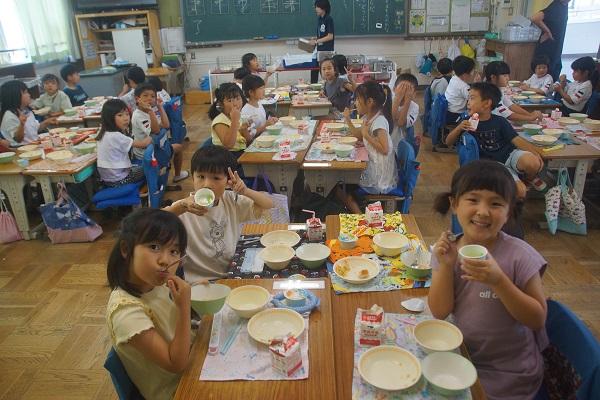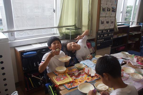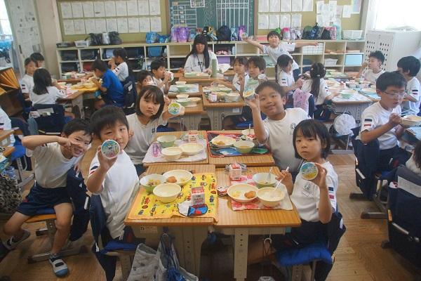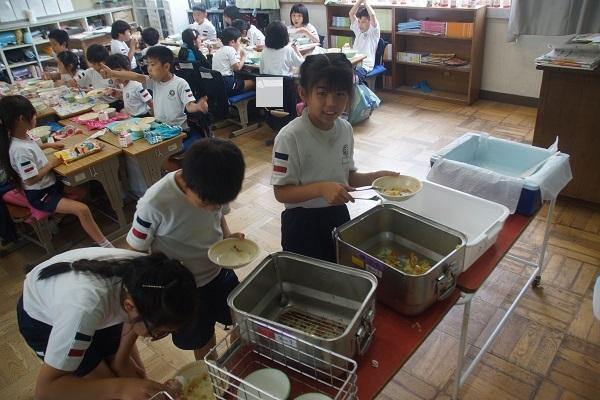 笑顔いっぱいで給食を食べる1年生に癒されて廊下を歩いていると、3年生が「サバじゃんけん」「牛乳じゃんけん」をやっていました。1年生だけでなく、3年生も「ざくざく煮」の食缶はどのクラスも空っぽになっています。片道30分以上歩いて中消防署に行ってきた3年生はその疲れも見せず、元気にモリモリ給食を食べる姿もとっても頼もしく感じました。