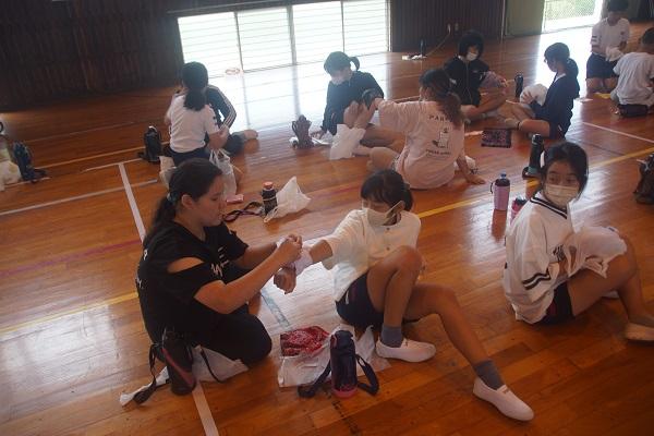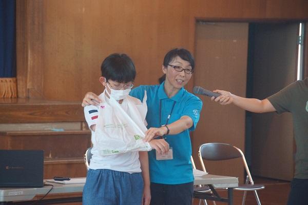 休憩時間には、当時の使用していた防空ずきんやわらぞうりのレプリカを手に取ったり、講師の方に質問したりして、講師の方々と交流を深めました。私も講師の方にすすめられ、防空ずきん着用しました。
