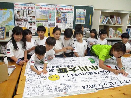 大宮那月さんがトップチームに登録されている朝日インテックラブリッジ名古屋が「なでしこリーグ1部」で優勝した報告も兼ねて、11月25日の夕方に磯辺小学校を訪問してくれました。大宮さんは、ラブリッジのU15とU18の両チームでも活躍し、それぞれの世代の全国大会にこれから出場します。U15大会は12月6日から、U18大会は1月3日から、それぞれ大阪で大会が開催されます。日本代表めざして、奮闘を続ける大宮那月選手をこれからも磯辺小のみんなで応援していきましょう!
