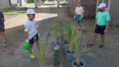 4年生は家庭で面倒を見ていたバケツ稲が集まってきました。学年園のお掃除をして、またみんなのバケツが勢ぞろいすることと思います。「実るほど 頭を垂れる 稲穂かな」 4年生の稲穂を眺めながら、自らの振る舞いを振り返ります。