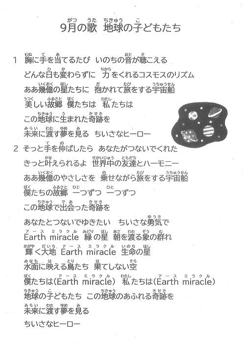 今日から9月の歌「地球の子どもたち」を歌い始めました。初めて歌う曲なので、当然のごとく今日はCDからメロディが流れるのみとなってしまいましたが、10月1日には、校区に建設された動物愛護センター「あいくる」の開所式があり、その開所式に参加する6年生が「地球の子どもたち」の合唱を披露する予定です。