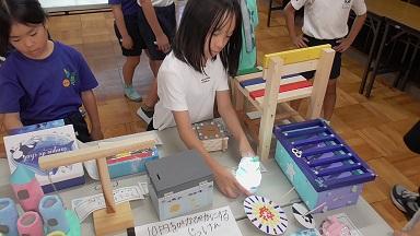 高学年は、過去の自分を思い出しながら、低学年の作品を楽しんでくれているようです。作品を壊さないか、ちょっとだけドキドキしますが、せっかくの作品ですから、触って、楽しんでもラうのがよいと考えています。思いやりのある磯辺小の子どもたちですから、大切に扱ってくれるものと信じています。これができるのもm磯辺小のよいところだと思っています。さすがです、磯辺っ子!