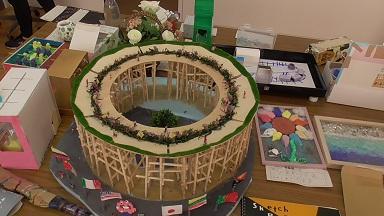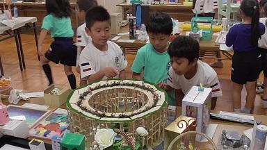 夏休みの作品展を見学した子どもたちも、2年生児童が制作した「大屋根リング」に驚いていました。私も本当に驚き、すごいなあと感心しました。