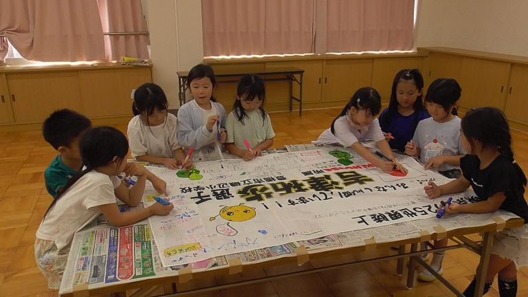 もうちょっとだけ おくないで としました。「屋内」と「億ない」でしたが、子供たちはきょとんとしてました。この暑さが続く限り「屋内で過ごしてほしい」と願いを込めました。
