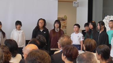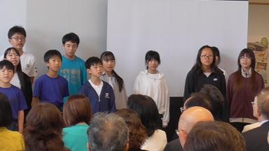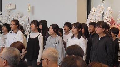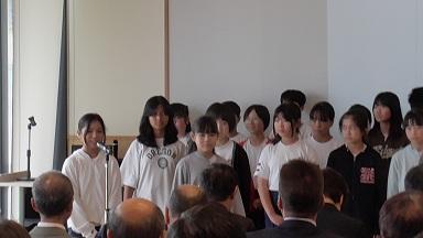 会の最後に、「あいくる」のオープンを祝い、未来への願いを込めて、6年生が「地球の子どもたち」を合唱しました。司会を務めていただいた「あいくる」のスタッフさんが、この歌声を励みに、愛物愛護に取り組んでいきたいとお話しいただきました。参加された方々の感動を呼ぶ、本当にすばらしい歌声でした。