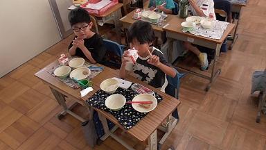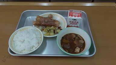 今日の給食は、いつもの牛乳、ごはんに、豚汁、くりとさつまいもの甘辛煮、そして米粉のいそべ揚げ(2本)です。磯辺小の「いそべ揚げ」がうれしくなって、子どもたちの給食の様子を見に行きました。