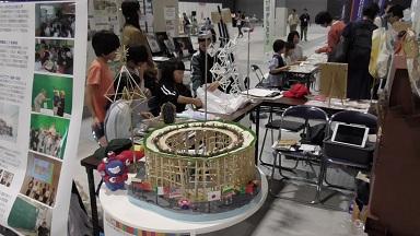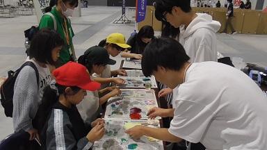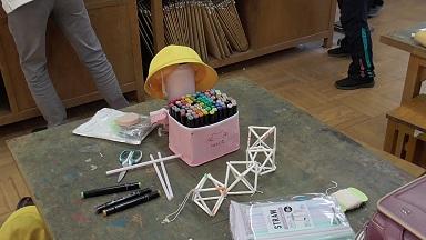 磯辺小のワークショップ会場には2年生児童が制作した大屋根リングとミャクミャクを飾っていただきました。一緒にワークショップ会場を運営してくれるのは、7月6日にemCAMPUSで行われたリトアニアフェアを共催していただいたALINA KUKKAさんです。