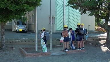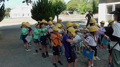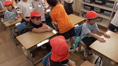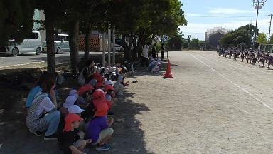 「ゆれがおさまった」との知らせを合図に、校舎内にいた子供たちは、「おはしも」を守って、運動場に二次避難を行いました。担任の先生は一人一人の顔を見て、人員確認を行いました。静かに待つことができるので、これもスムーズに行うことができました。立派です。