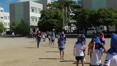 休み時間がスタートスタートして5分ほどして、訓練の「地震速報」が流れました。運動場で遊ぶ子供たちは、運動場の中心で固まって、安全姿勢をとってくれました。