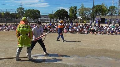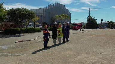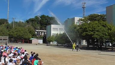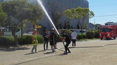 地震から火災が発生したとの想定で、磯辺分団には放水訓練を披露していただきました。平日ではありましたが、本校がめざす「顔の見える地域防災」に、2人の現役痰飲、3人のOBが訓練に参加してくださいました。
