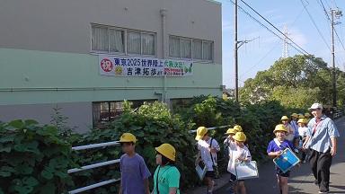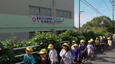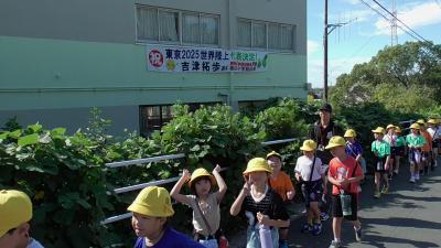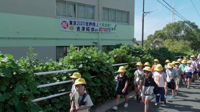 道中には今日も吉津拓歩選手の横断幕が輝いています。世界8位のリレーメンバーが磯辺小を卒業したなんて、信じられません。今の磯辺小にもそんな可能性を秘めた子がいそうな予感がします。