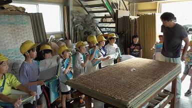 工房の中に入り「畳表の張り替え」の一連の工程を見せていただきました。今では「めん」の縫い付けなど機械で行うことも多くなりましたが、包丁を使った畳表の裁断やたたみ針を用いた補修など、随所に職人の技を見せていただきました。職人の技に触れることは大人にとってもとても楽しい学びになります。