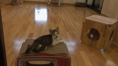 最初に「milk」と名付けられたキャットルームを見学しました。2匹の子猫がじゃれあったりして、とてもかわいらしい姿を見せてくれました。ここでは「愛くるしい」姿ですね。