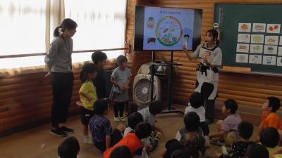 3年生の外国語活動も見てもらいました。今どきの年長児はさすがです。果物の名前を英語で聞き取り、さらにその意味を理解し、会話することもできてしまいます。いちご、ぶどう、りんご、みかん、みんな英語で言えました。そんなバナナです。すごい年長児でした。