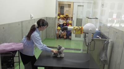 バックヤードを見学中の子どもたちの姿を見ることができました。こちらはトリミングルームです。
