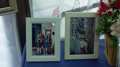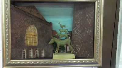 ミニチュア教室の先生の作品も多く飾られていました。「さすが」の作品ばかりです。作品の中には、作者の先生が訪れたドイツのメルヘン街道の景色がモチーフになっているものもありました。メルヘン道は「グリム童話」ゆかりの土地を結んでいるそうです。写真の人物は、夏休み前に1週間ほど磯辺小に海外から体験入学に来てくれた子のお父さんの少年時代だそうです。