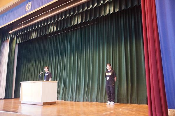 続いて、3週間にわたって教育実習を土曜日に終えることになる2人の実習生から、子どもたちにあいさつがありました。この経験を通して、教員になる決意をより一層強くしてくれたようです。磯辺小の素直で元気な子どもたちは、実習生を本気にさせる魔法をもっているようです。