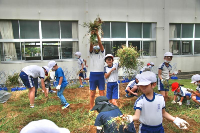 昨日は、夏の間に茂った雑草をみんなで抜きました。昨夜雨は降ったものの、雑草の根は強く、なかなか簡単には抜けませんでした。それでも、友だちと楽しみながら活動を行いました。