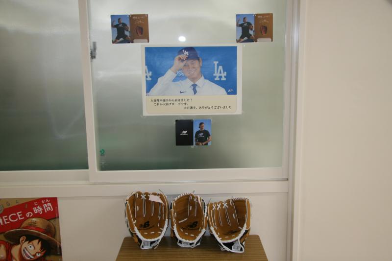 本日は,本年度最後の授業参観日になります。子供たちの成長の様子を見に,ぜひご来校ください。また,校長室前には大谷グローブを展示しております。各学年の展示物と一緒に見てください。このグローブは,この後学校のグローブとして体育の授業に使用していきます。