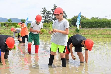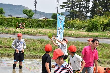 PTAの方に畦から苗を投げてもらい、ナイスキャッチ!秋にはおいしいお米が実るといいですね。