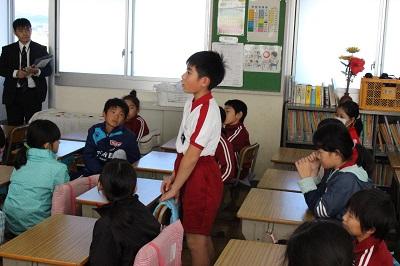 晴れ。冷たい風の吹く、寒い日となりました。3時間目に不審者対応避難訓練をしました。男の先生3人で不審者を取り押さえ、子どもたちは全員体育館へ避難することができました。警察の方と一緒に、登下校中に不審者にあったときにどうしたらよいのか考えました。普段から自分の身は自分で守るように気をつけましょう。