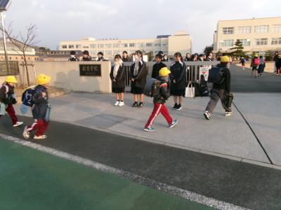 生徒会役員だけでなく、ボランティアの中学生も参加し、正門前はにぎやかです。