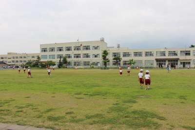 南校舎外壁工事のための足場の撤去作業が進み、きれいになった校舎がほぼ見えてきました。ピカピカの校舎と美しい青空の下、今日も前芝っ子は笑顔で遊んでいます。