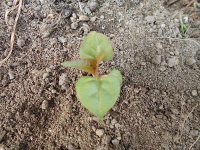 職員室前の花壇にツルレイシ(ゴーヤ)の種をまきました。いろいろな芽が出てきました。さて、この中にツルレイシの芽はあるでしょうか?
