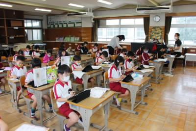 2年生音楽の授業をタブレットを使って行っていました。感染症対策で鍵盤ハーモニカを使えないからです。「かっこう」と「かえるの がっしょう」をみんな真剣に練習していました。何人もの子どもが「聴いて」「聴いて」と披露してくれました。全員での合奏も立派にできました。みんなすごいです。