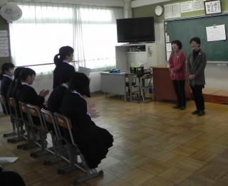 小学校高学年の子どもたちを招待し、いっしょに「変わらないもの」(混声三部合唱)、小学校5年生と中学校2年生で「翼をください」(混声三部合唱)を合唱しました。中学校の森田恵三子先生(音楽担当)が小学校の音楽授業も担当しているので、スムーズに声を合わせることができます。