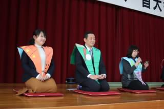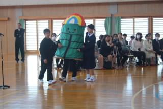 生徒会執行部が在校生を代表して歓迎のパフォーマンスを行いました。今年も前芝中イメージキャラクター「どうたくん」が大活躍!