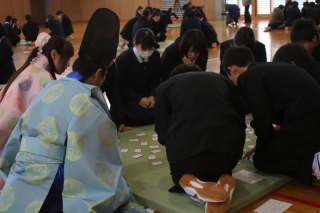 2畳のたたみの上に取り札を並べ、学年・男女の混合グループで競います。前半が終わったところで、取った枚数順にグループを再編成し、さらに競い合います。