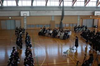 今年の卒業式は新型コロナウイルス感染症対策のため縮小した形で行いました。豊橋市内全中学校が来賓と在校生の参加を見合わせることとなり、来賓席はなくし在校生の席は空席のまま、卒業生、保護者、職員で式を行いました。
