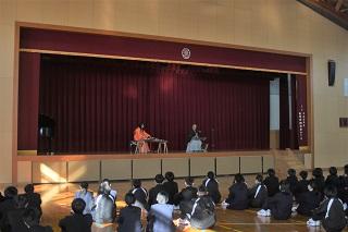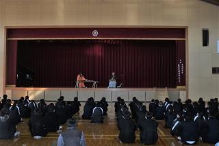 曲目は「花と少女」と「春の海」。どちらも耳馴染みがよく、生徒は情景を想像しながら聴いているようでした。体育館に響く尺八と箏の音色に感化され、新鮮な気持ちで3学期を迎えることができました。