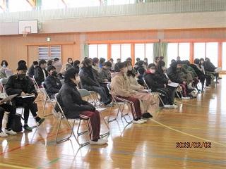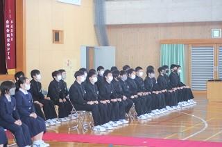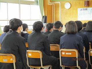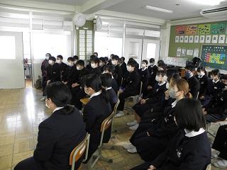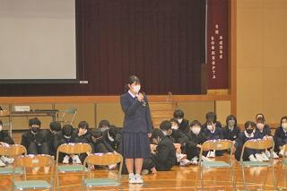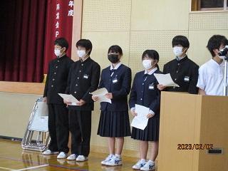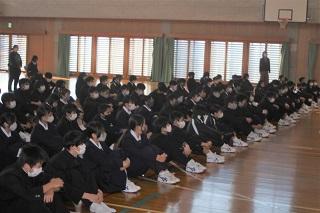 寒さに負けず,体育館で終業式を行いました。学年代表の生徒が2学期の振り返りと3学期に頑張りたいことを語ってくれました。