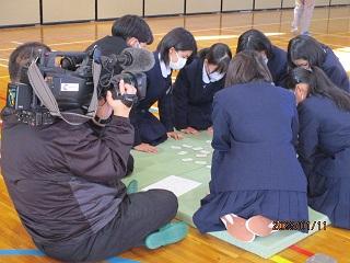 読み手は先生方。全校生徒を学年関係なく12グループに分け,十分な換気をして競い合いました。TV局の取材もあり,生徒の笑顔がはじけました。