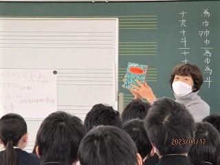 小学校時代は大型絵本や紙芝居,手遊びを入れた読み聞かせの会を経験している生徒たち。中学校では,視覚的な情報は語ってくださる方の表情のみです。語りからストーリーの場面を自由に想像し,その世界に浸ったひと時でした。