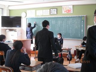 向井先生と生徒の楽しいやりとりに参観した先生方も笑顔になりました。授業後の研究協議会では、全体の理解度と次の学習課題に進むタイミングについて協議されました。少人数だからこそ教師の目が行き届き、個々への声掛けができます。学力アップにつながってほしいものです。