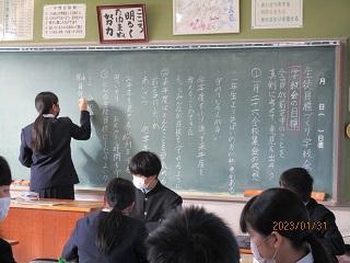 前芝中学校では、全校生徒で来年度の「生徒目標」(生徒会スローガン)を決めます。今日は各学級で学級会議を開き,原案を考えました。