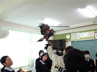 養鶉業を営む塩野谷さんからは,仕事の内容や苦労,これからの夢を語っていただきました。また,一緒に連れてきていただいた鷹(たか)のピーちゃんは生徒に大人気でした。