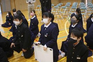 前芝中学校では、3学期始業式のあと、日本の伝統音楽に親しむために「新春演奏会」を行います。今年は尺八と箏の演奏です。