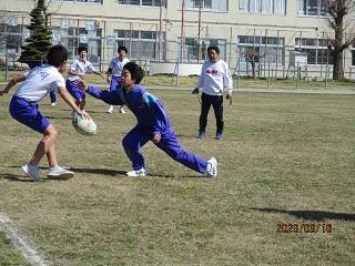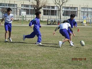 1年生男子が保体の授業でタッチラグビーをやっていました。タッチラグビーとは,スクラムやタックル等身体接触の代わりに,鬼ごっこのようなタッチをする安全なラグビーです。