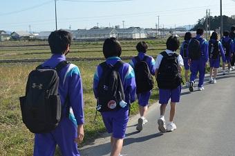 前芝中学校では,在校中に暴風警報等が発令され安全に下校できる状況であると判断できた場合,①各自で下校,②前芝小学校通学団で下校,③保護者の引き取りで下校の3択になります。今日はその下校訓練を小中合同で行いました。