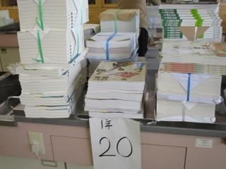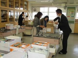 令和2年度の教科書準備作業を職員で行いました。9教科の教科書を各クラスごと人数分そろえます。