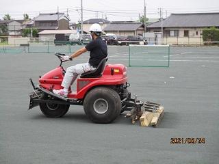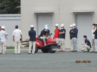 グランド整備のために市のグランドレーキをお借りしてきました。ちょうどよい機会なので,用務員さんたちを対象にグランドレーキの使い方を研修することになりました。