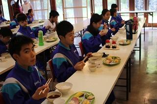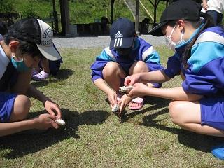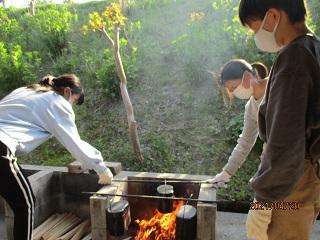 頂上からはバスで新城市山びこの丘へ到着。入所式のあと、さっそく飯ごう炊さんです。メニューはカレーライス。5年生の時の経験をいかし、美味しいごはんとカレーができました。あまりに美味しすぎて食べ過ぎてしまった子もいました。