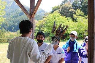 特製味噌だれをかけた五平もちと塩をふった鱒は炭火で焼いてもらい、美味しくいただきました。「いただきます!」 まさに命をいただく体験ができました。