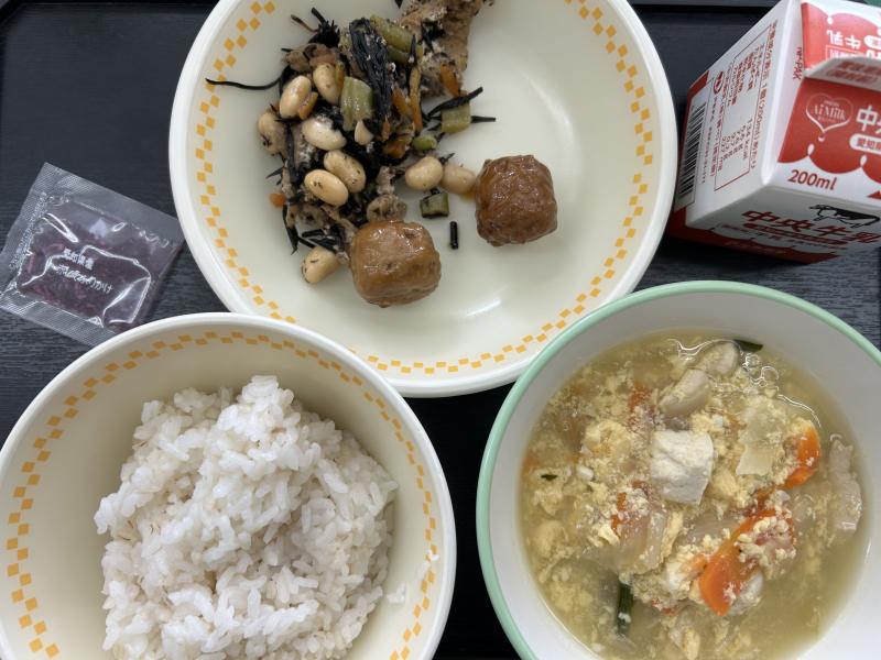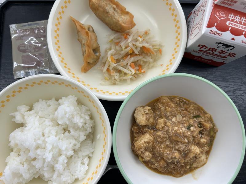 今日の給食は、ごはん、ひじき入り揚げぎょうざ、もやしいため、マーボー豆腐、ココア糖です。